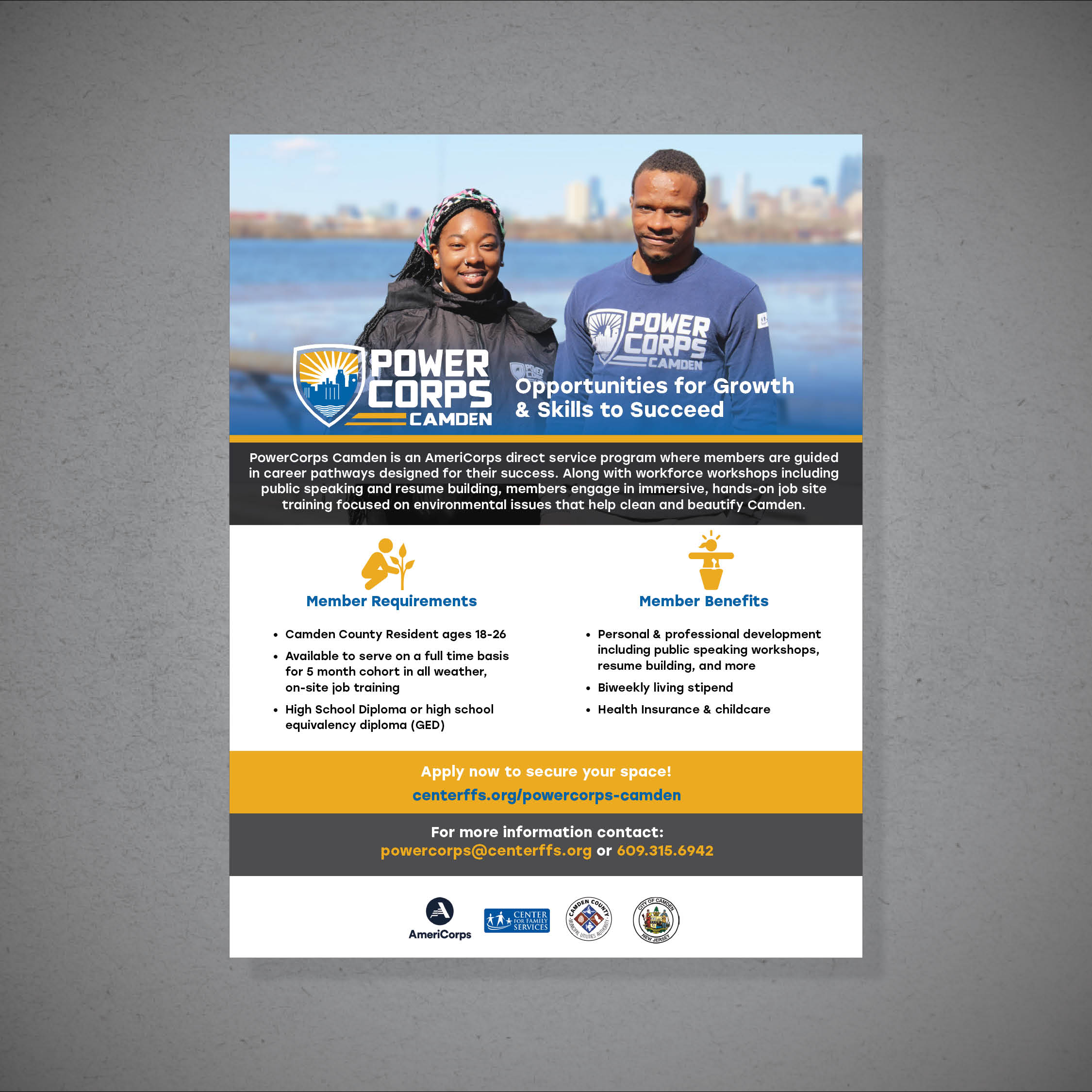 PowerCorps Camden is an AmeriCorps program based in Camden, New Jersey that recruits young leaders to tackle pressing environmental challenges in their community. Client needed recruitment marketing material that followed multi-agency branding and funding requirements. A mini branding guide was also created for program staff to easily reference for their own social media management.